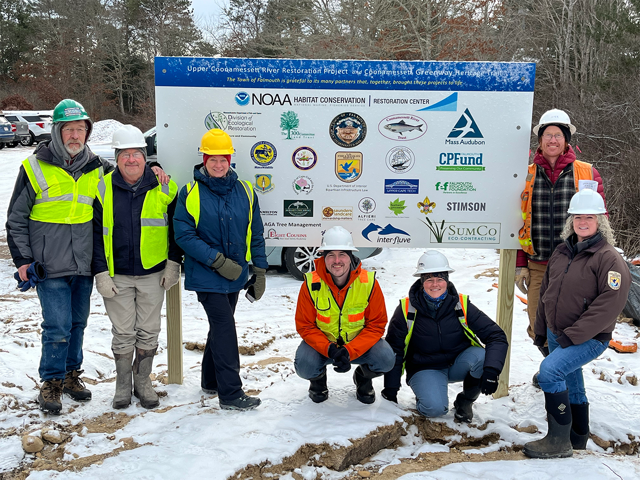 Left to right; Mark Kasprizyk, Town of Falmouth; Jim Turek, NOAA Habitat Conservation/Restoration Center; Beth Lambert, DER; Eric Ford, DER; Annie Spangenbergere, InterFluve; Nick Nelson, InterFluve; Jamie Masterson, US Fish and Wildlife).