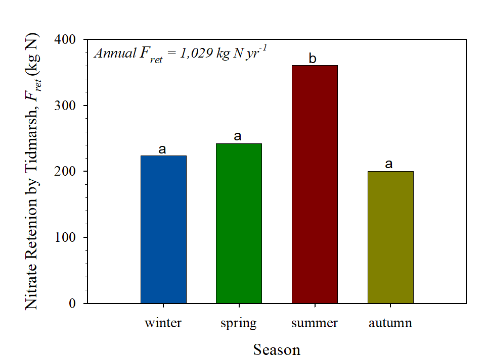 Seasonality of NO3- retention (Fret) for Tidmarsh between Jan. 2020 and Jan. 2021 (N = 7-11 per season). Seasons correspond to the following dates: spring (1 Apr. to 30 Jun.), summer (1 Jul. to 30 Sep.), autumn (1 Oct. to 31 Dec.), winter (1 Jan. to 31 Mar.) Bars not connected by the same letter are significantly different at 95% confidence (two-tailed t test; p value ≤ 0.05).