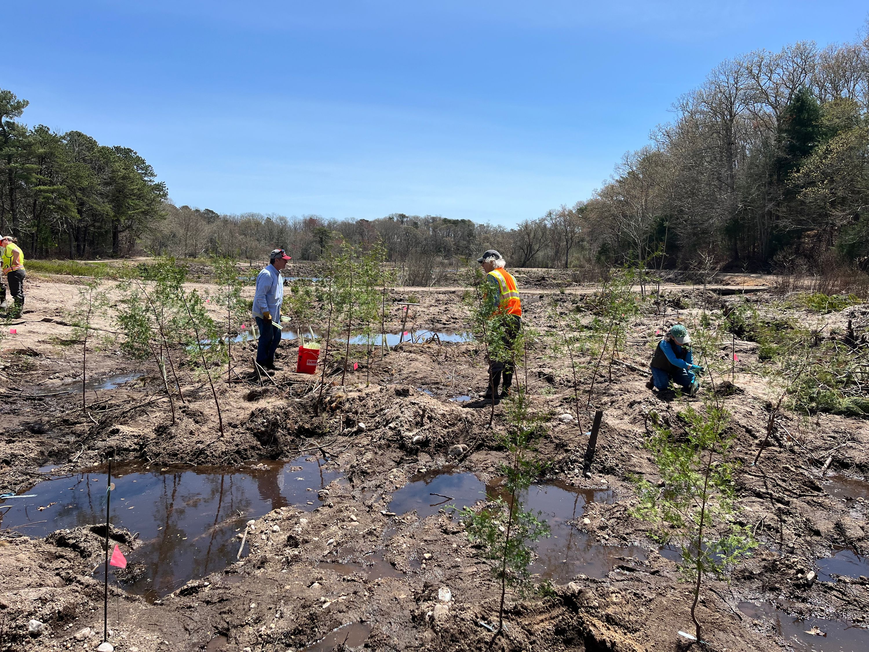 Glorianna Davenport and volunteers planting AWC amongst micro-topography in Cell 1 at the Upper Coonamessett River Wetlands Complex