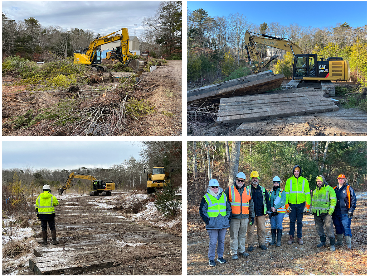 Excavators clear brush and lay mats. Group shot (l to r) Betsy Gladfelter,Steve Fuller (SumcoEco), Manny de Costa (Interfluve), Annie Spangenberger (Interfluve), Dylan MaCarthy (Falmouth DPW), Jarrod Martellucci (SumcoEco), Sara Grady (Mass Audubon).