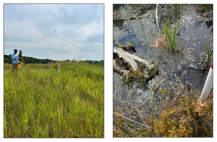 Joey operates the total station (left) for cross-sectional stream surveys (right).