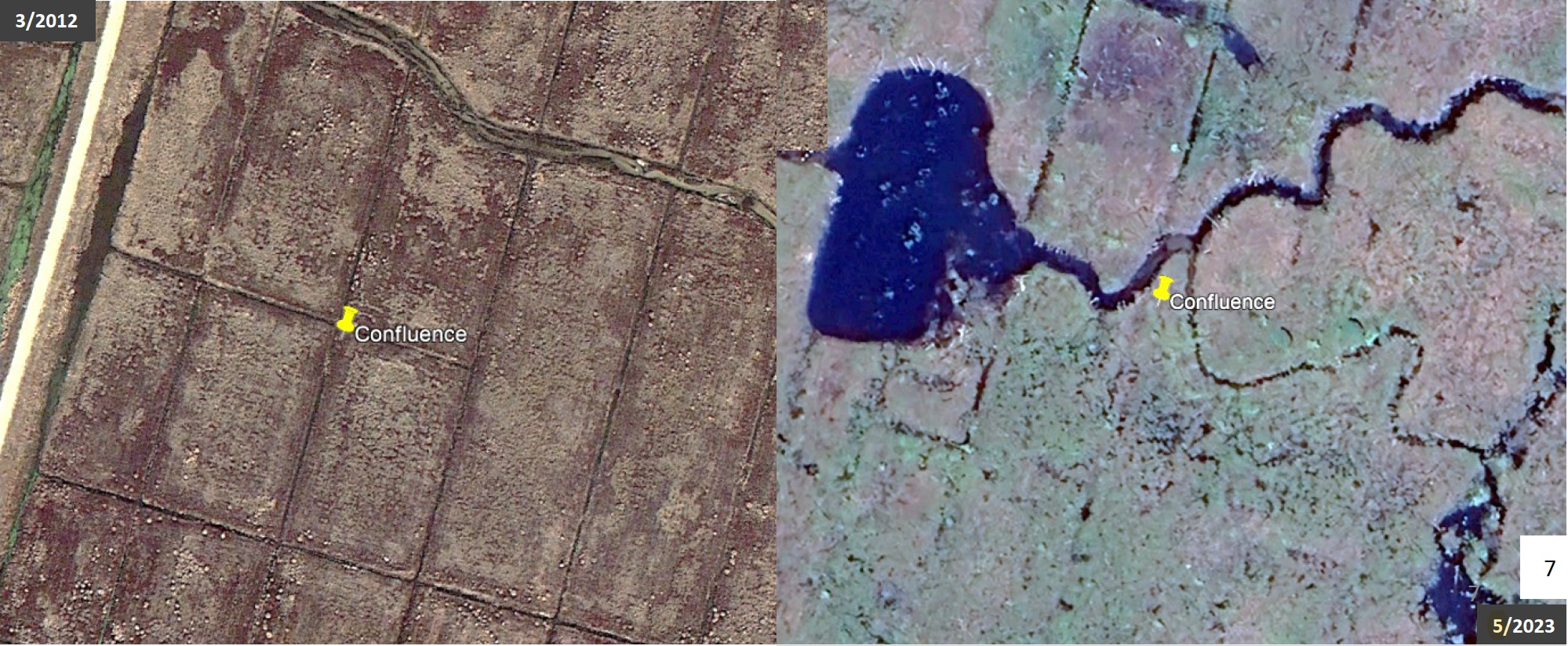 Google earth views of stop 3 (Confluence), from 2012 and 2023