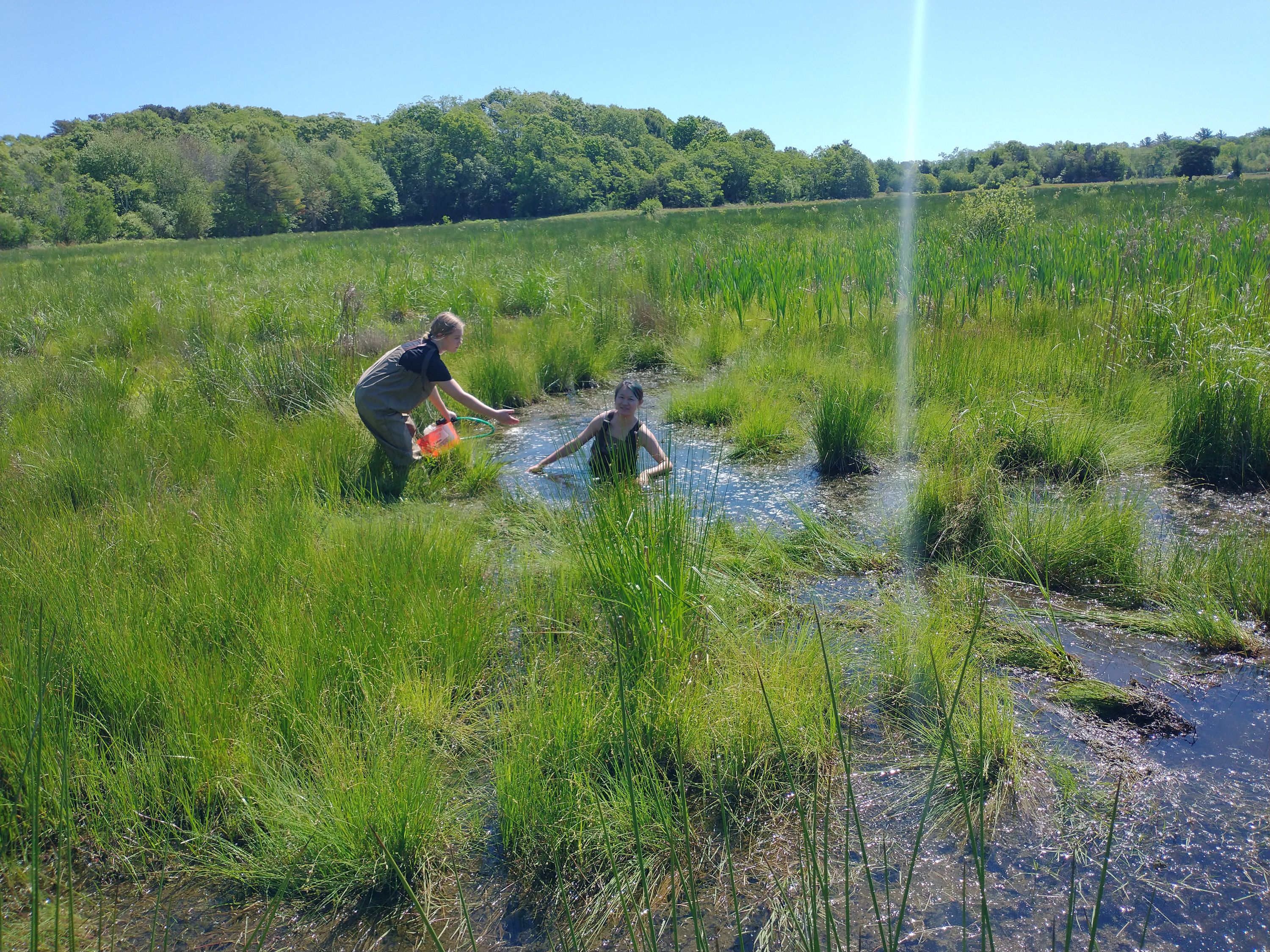 Near piezometer 7 at Foothills Preserve, Diana and Frances install a seepage meter to capture groundwater inflows.