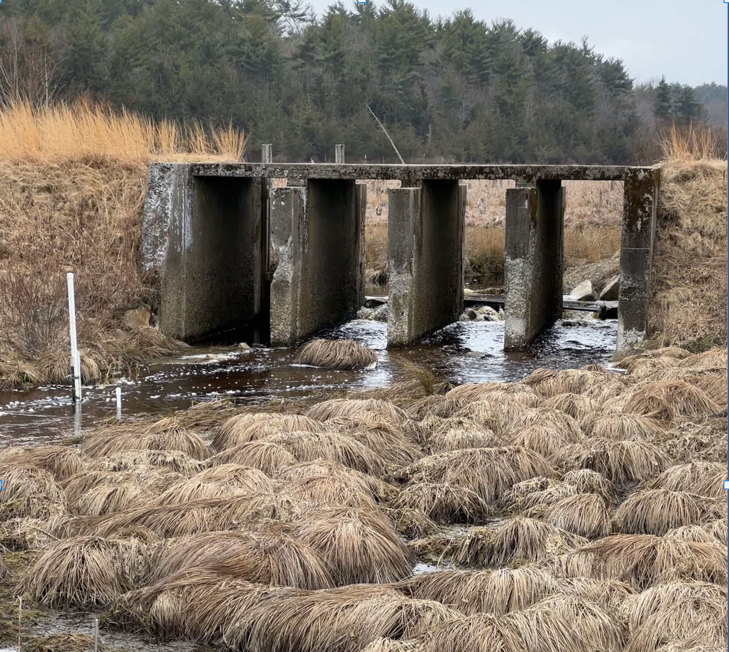 Dam constructed to impound large reservoir to supply water to cranberry bogs