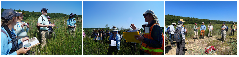 Participants gather to learn about restoration actions and to learn specifics of an area; they then fan out and reassemble to discuss observations.