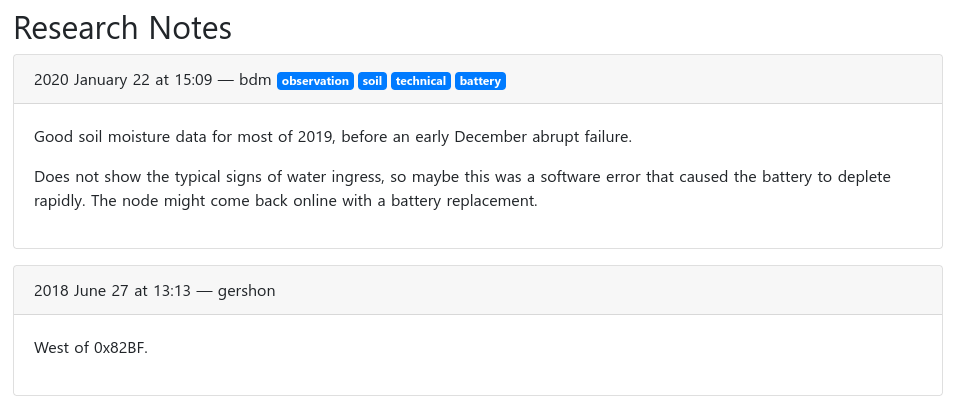 Pictured below is one of the prototype interfaces I built for my sensor network, based around a geotagged database of sensors. In addition to the actual data (shown in plots below), the system also stored and displayed photos of each individual sensor and research notes. This was invaluable for documenting the installation of each sensor and working with collaborators to interpret the data.